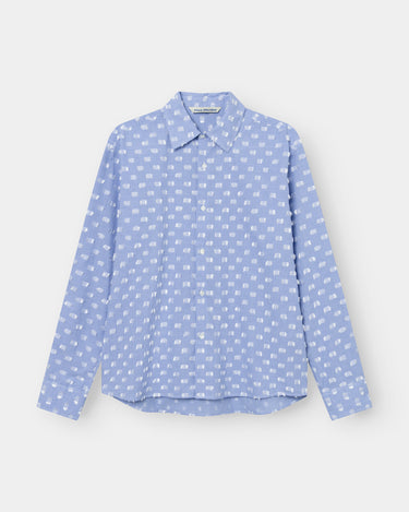 A shirt made from a light 114 GSM fabric in 90% cotton / 10% viscose. A blue / white check Portuguese deadstock fabric weaved with a fil coupé technique adding white fringes / cut yarns to the fabric giving the silhouette a bit of soft structure. In a relaxed fit with slightly extended back. Featuring mother of pearl buttoning, spread collar and a french fold placket.