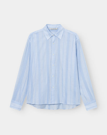 A shirt made from a light 105 GSM fabric in 100% cotton. A light blue Portuguese deadstock fabric with blue pleated stripes. In a relaxed fit with slightly extended back. Featuring mother of pearl buttoning, spread collar and a french fold placket.
