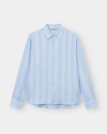 A shirt made from a 180 GSM tencel/linen/cotton blend fabric. A blue Portuguese deadstock fabric with thicker textured white stripes. In a relaxed fit with slightly extended back. Featuring mother of pearl buttoning, spread collar and a french fold placket.
