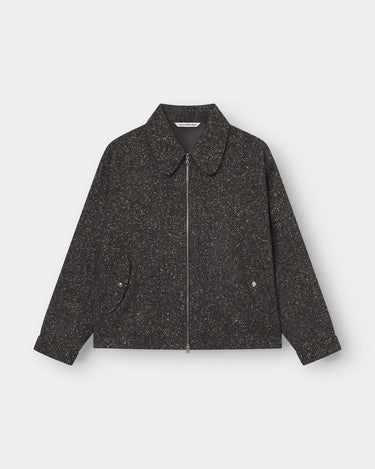 A jacket made from a heavyweight Italian deadstock wool blend carded herringbone fabric in black and brown. The inside of the jacket is finished off with a brown satin lining. In a relaxed fit with wide sleeves and a straight hem, both with snap buttons to adjust width. Featuring a two-way YKK metal zipper, two rotated front patch pockets with curved flaps and metal snap buttons, a left chest inner pocket and snap buttons at the collar for neck closure when flipped up.