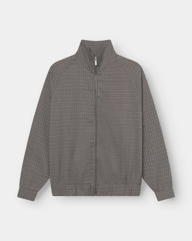 A relaxed fit and easy to wear track top style with full zip. Made from a brown and sand  houndstooth jersey fabric. Featuring a high funnel neck and elasticized cuffs and hem.