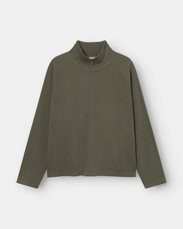 A relaxed fit and easy to wear track top style with a tonal green YKK zipper. Made from a soft and stretchable army green rib fabric - deadstock sourced in Portugal. Featuring a high funnel neck and flatlock stitching.