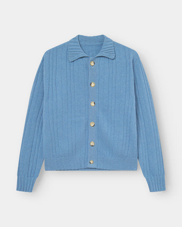 A relaxed fitted blue cardigan knitted in Italy from 100% recycled post consumer wool (made in the USA pre-owned garments). Body is knitted in links with different stripe dimensions adding a bit of structure to the knit. Finished off with 3x3 ribbed collar, hem and cuffs. Featuring a wide placket with big cream deadstock buttons and a big spread collar. Garment has been washed with wool softener for a soft and non-itchy feeling.