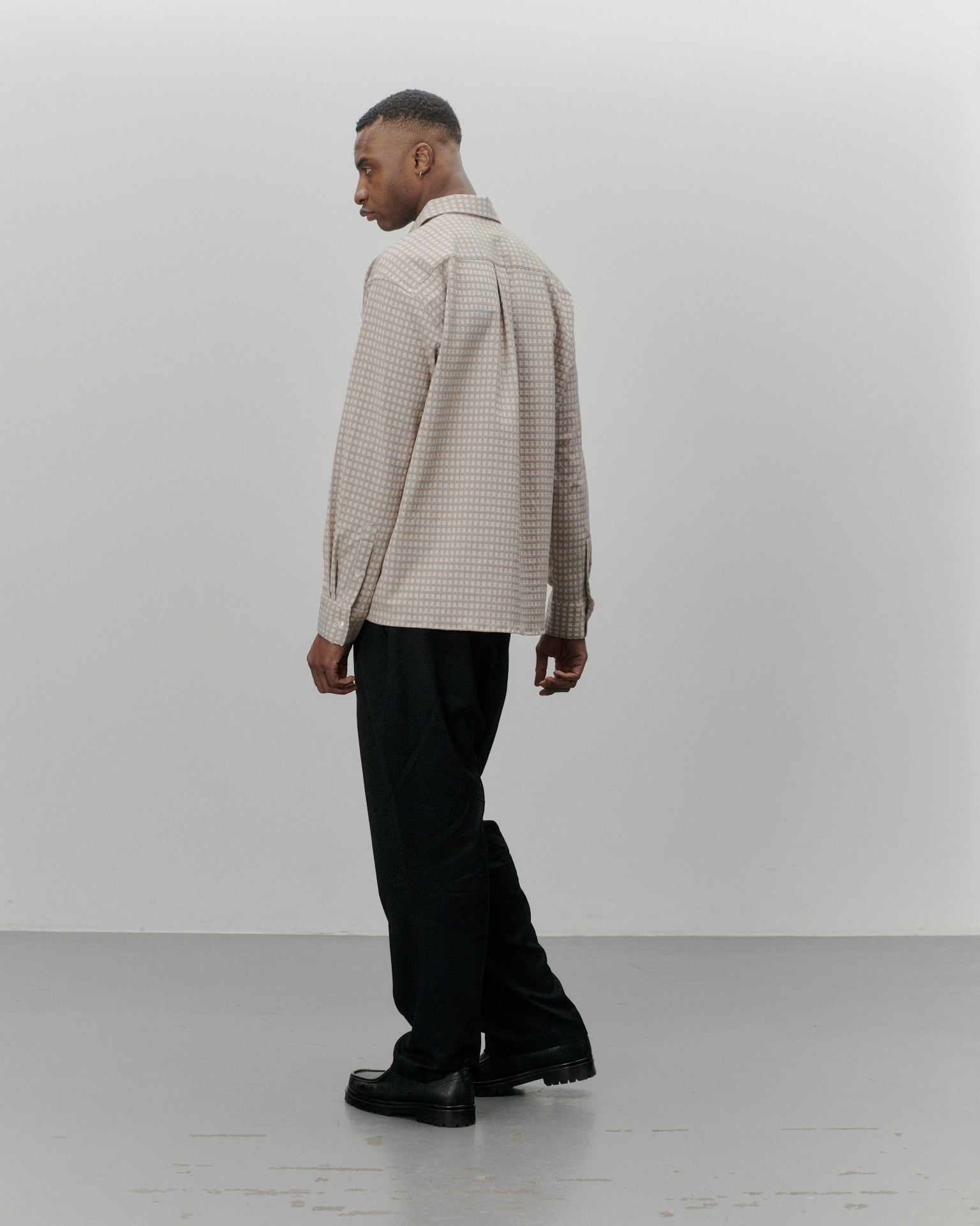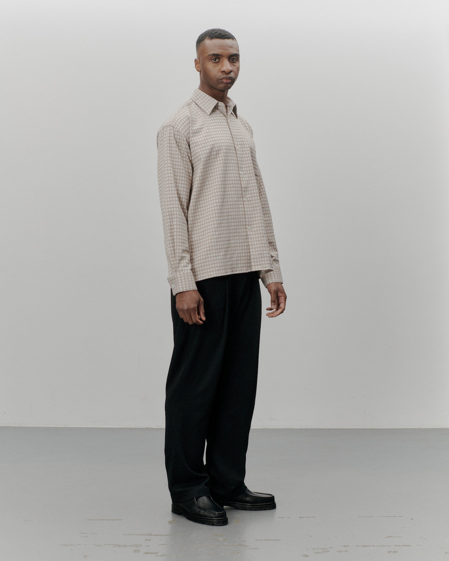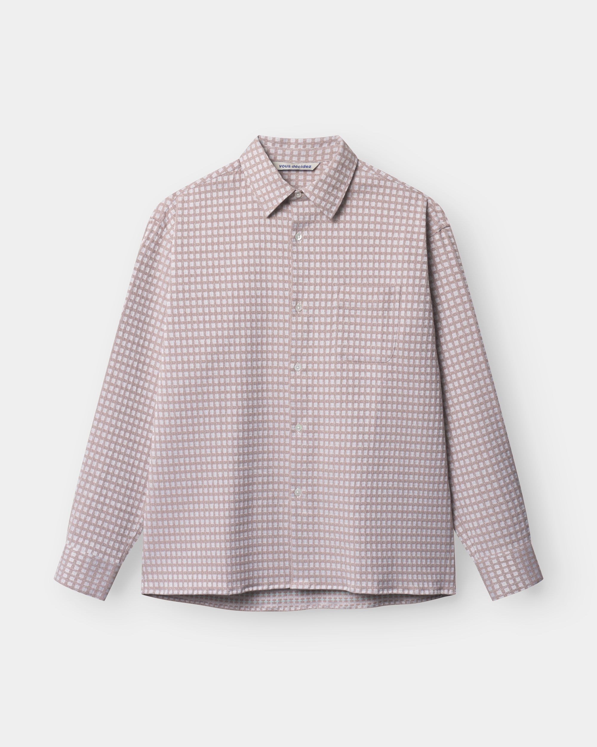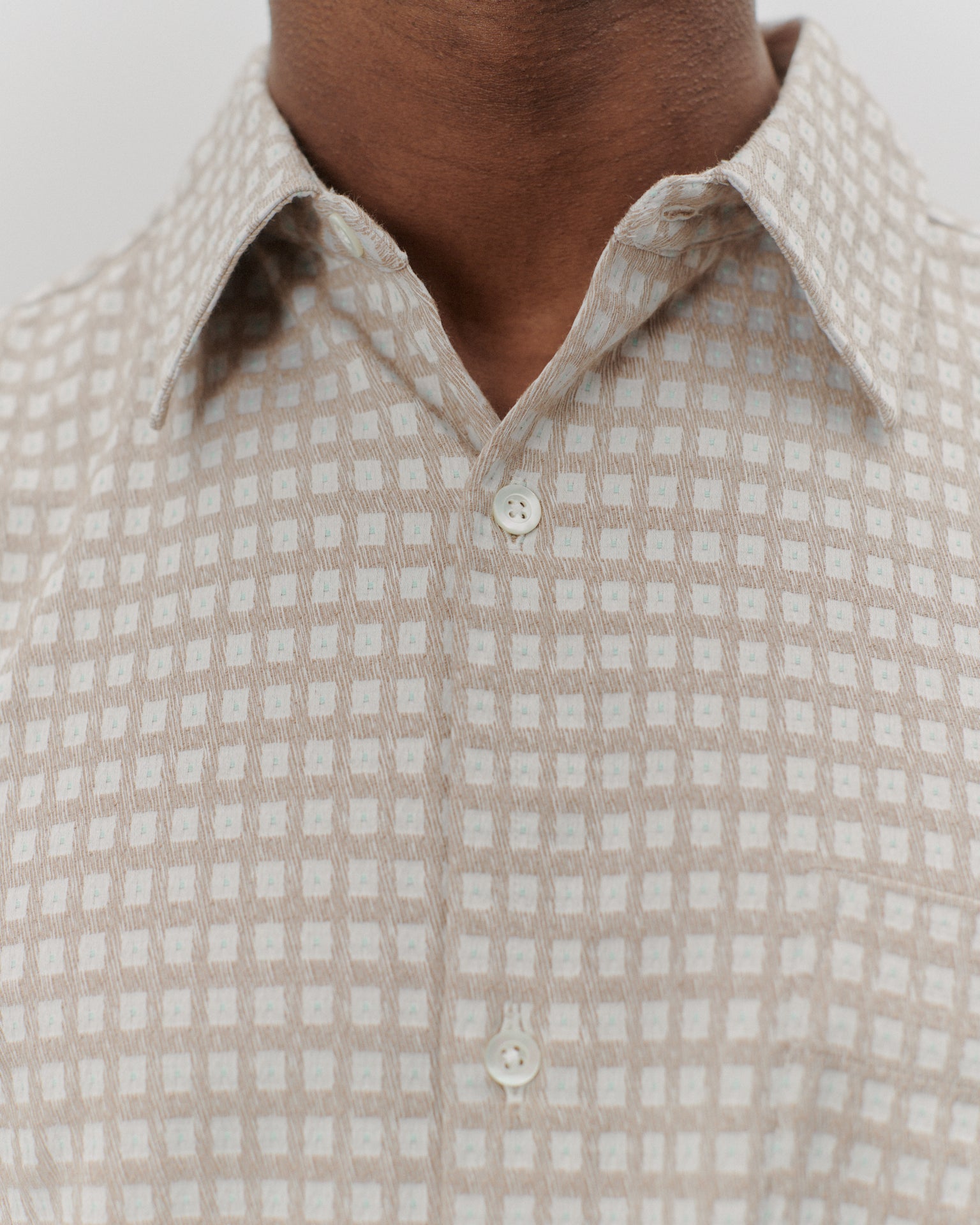 A shirt made from a 245 GSM structured check Italian deadstock fabric with small turquoise dots. A soft yet slightly sturdy fabric due to its cotton / polyester / elastane composition. In a relaxed fit with straight hem. Featuring mother of pearl buttoning, spread collar and a french fold placket.