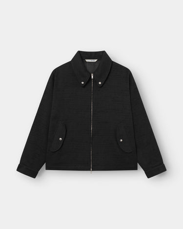 A jacket made from a medium weight 420 GSM Italian deadstock fabric. A textured cotton/polyester blend fabric in plain weave with thick black slub yarns creating an irregular textured look. The inside of the jacket is finished off with a black satin lining. In a relaxed fit with wide sleeves and a straight hem, both with snap buttons to adjust width. Featuring a concealed two-way YKK metal zipper, two rotated front patch pockets with curved flaps and metal snap buttons, a left chest inner pocket and snap buttons at the collar for neck closure when flipped up.